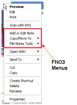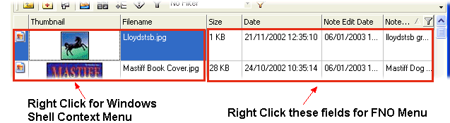 The Windows shell context menu is selected by a right click in the Icon, Thumbnail or Filename fields