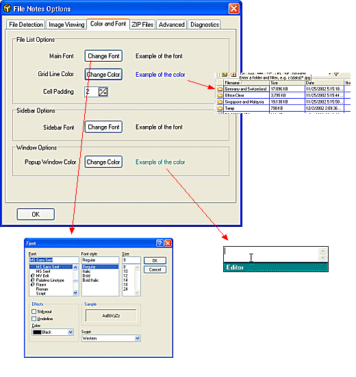 From this tab change the Font used in the File List and Sidebar panes. Also change File List grid line color and popup window colors.